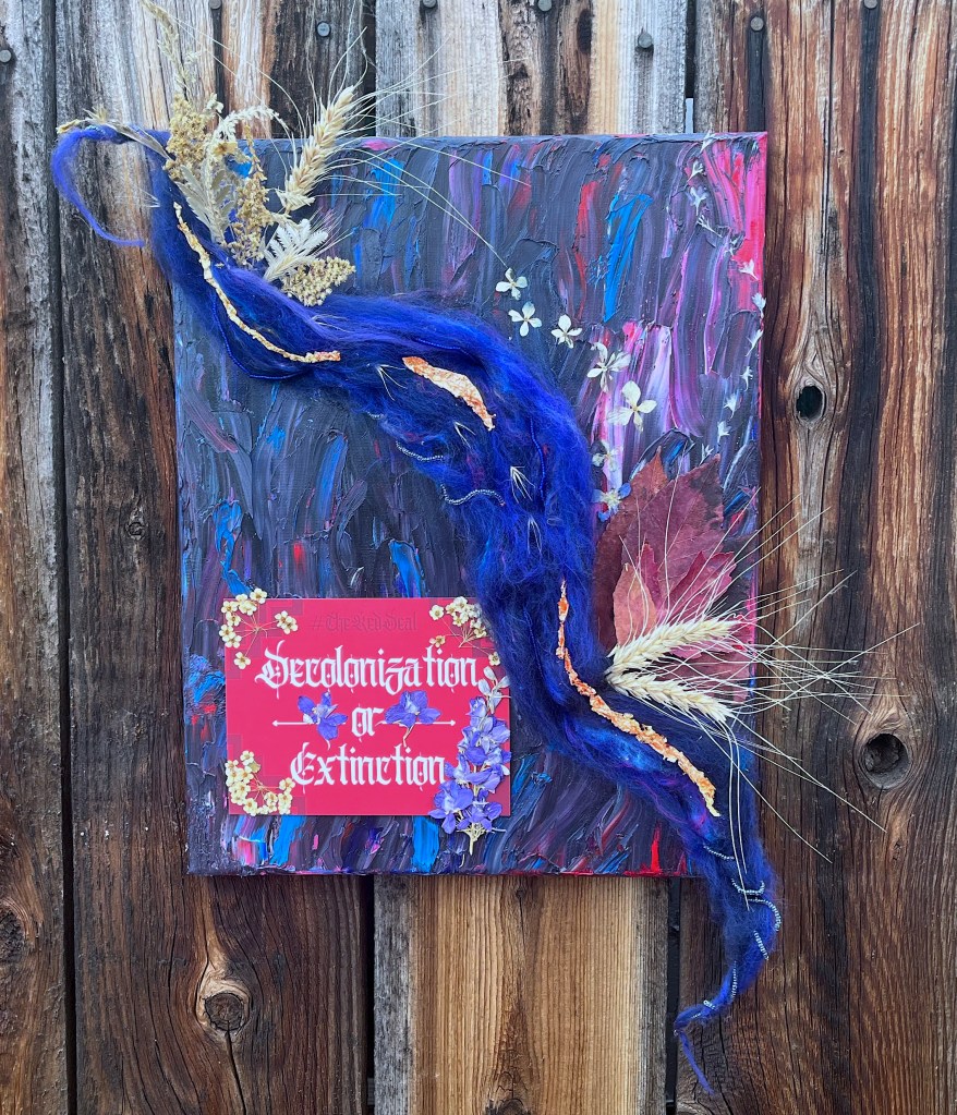 image description: an aged cedar fence with a canvas painted in blue and red oils with a river of navy roving yarn interspersed with copper wire, glass beads, and various grasses and flowers meanders diagonally across. In the lower left quadrant is a bright red postcard from The Red Nation with white gothic-style text that reads “Decolonization or Extinction” and in dark red above “#TheRedDeal.”